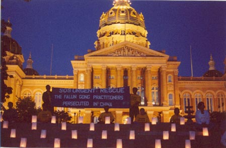 晚上,学员们又聚集在爱荷华州府大厦前烛光守夜,悼念国内被迫害的同修。