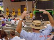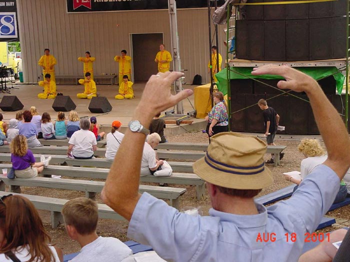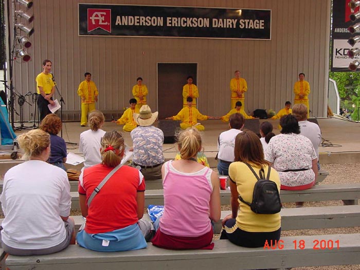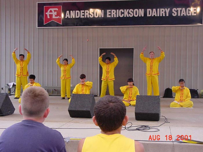 【明慧网2001年8月30日】8月18日,来自爱荷华与明尼苏达州的十几名学员在爱荷华州游园会(State Fair)上作了将近40分钟的功法表演,并在游园会内外炼功洪法。时值爱荷华州府得梅因(Des Moines)市宣布法轮大法周。在功法表演时,负责解说的学员以通俗的语言向观众介绍了5套功法,修炼的概念,大法在世界范围内的洪传及受到的褒奖,同时以实例讲诉了中国江泽民政府对法轮功修炼者的残酷,呼吁善良的人们伸出援手。