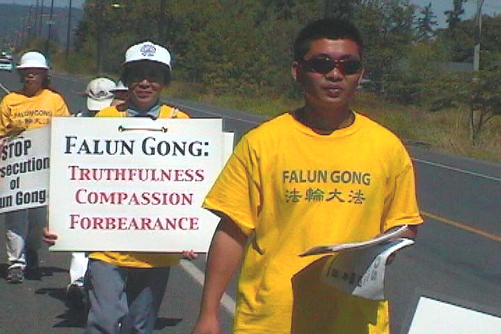 ![]() 烈日炎炎,经受考验,万难无阻。正午不停步,保证日行20英里的计划不能含糊。英文流利的大法弟子一路见人就发资料,再小跑赶上一步不停的队伍。 |