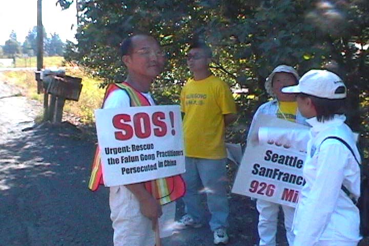 ![]() 路上经由的地方,见人就停,送上大法资料。告诉他们我们从西雅图步行去旧金山中国领事馆,经由这里,想告诉您法轮大法的纯善和江泽民对大法迫害的邪恶,希望您的良知支持。 |