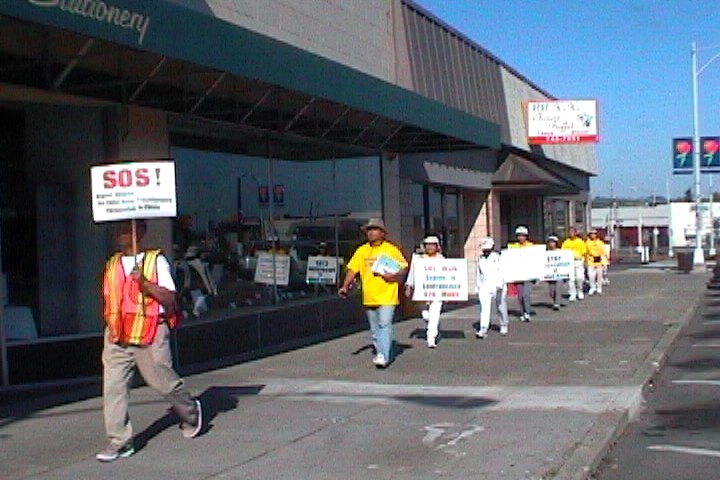 ![]() "SOS Walk Seattle to San Francisco 926 Miles" - SOS紧急救援步行自西雅图到旧金山926英里。前面的看板有“法轮大法 - 真善忍”。一路行车来往,无不目击,讲真相的好办法。 |