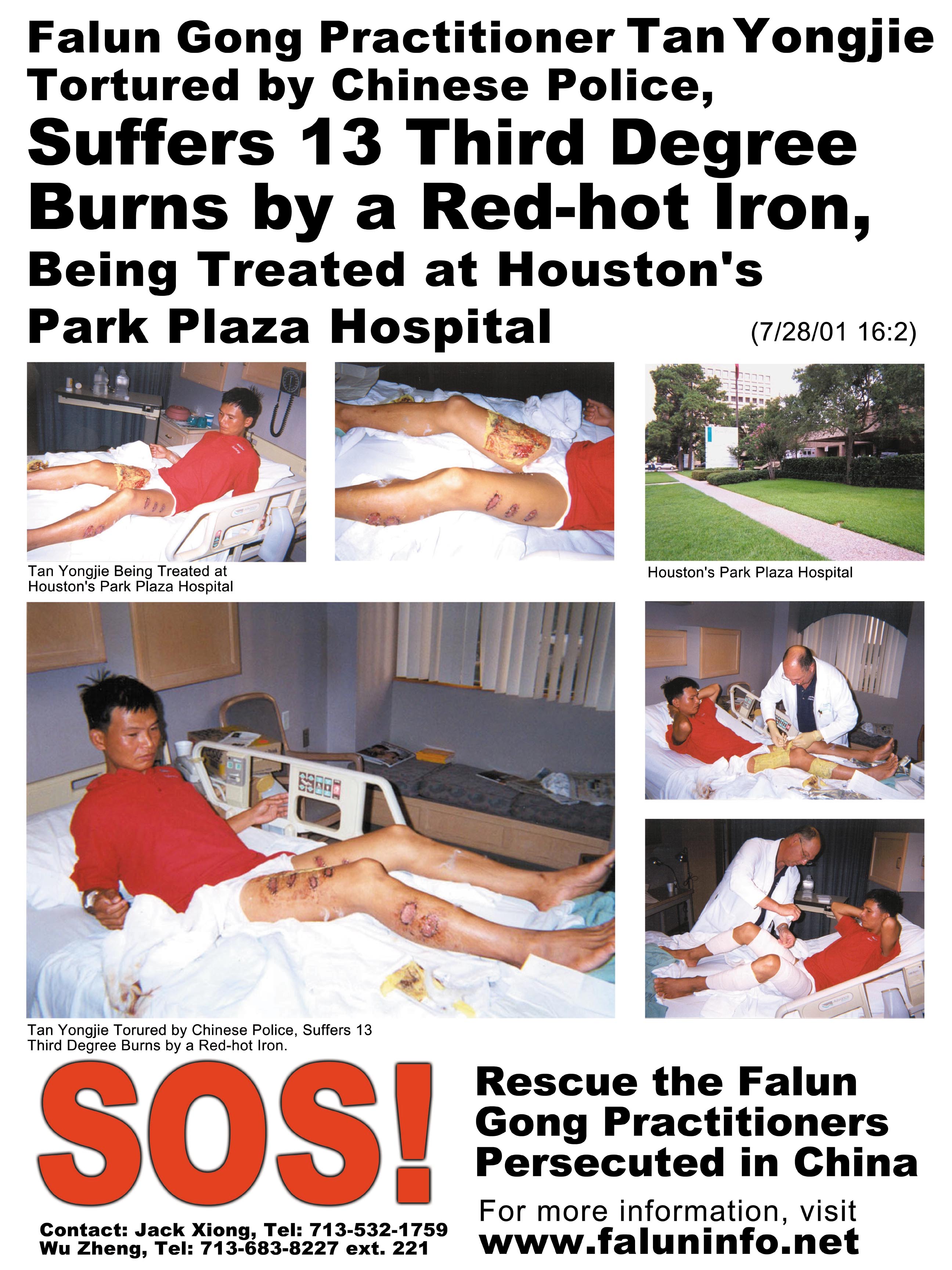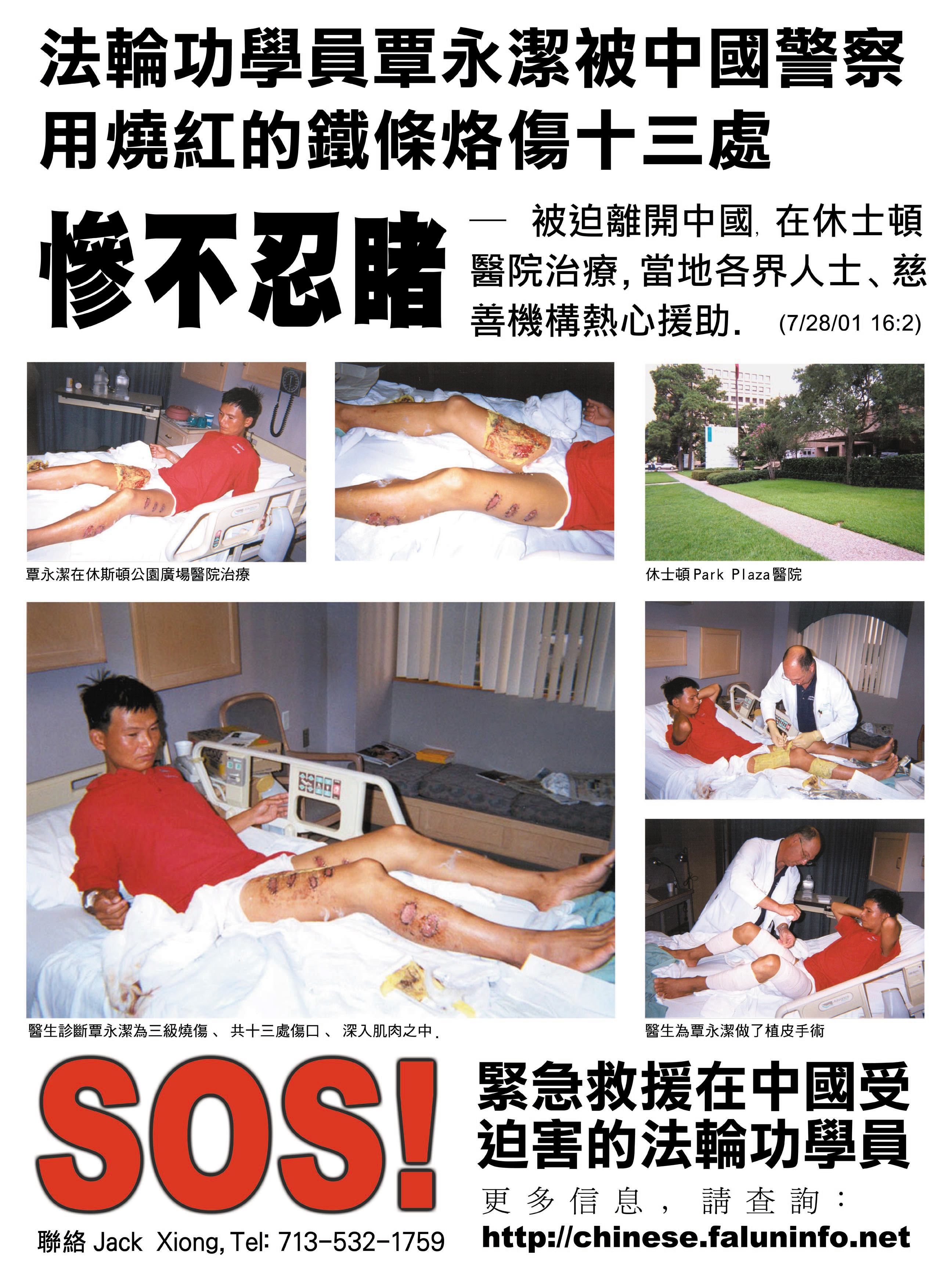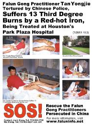 海报:法轮功学员覃永洁被中国警察用烙铁烫伤十三处