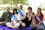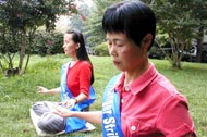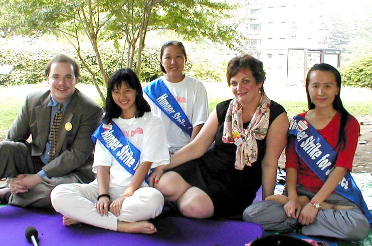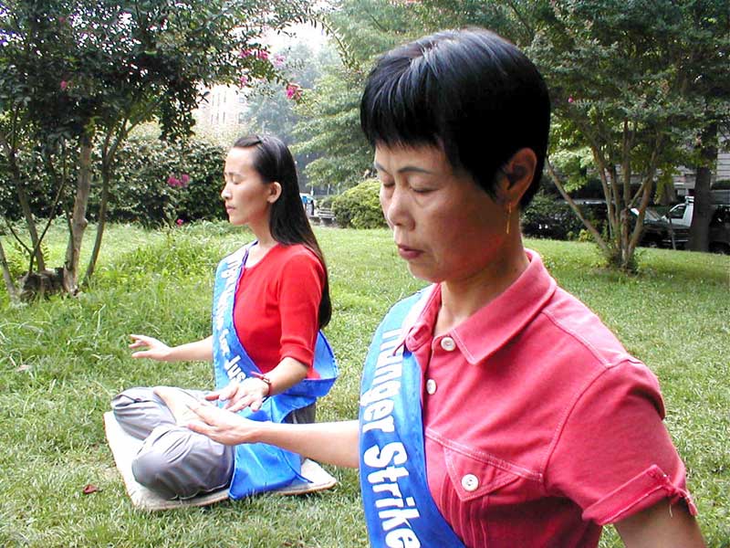 | 罗拉和另一位美国支持者与三位来自纽约、 佛罗里达及DC的绝食学员合影留念。 | 绝食学员在晨炼。 |