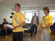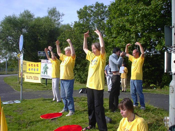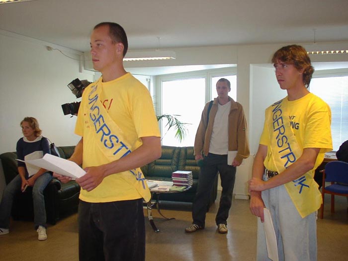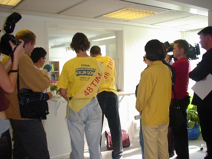 10点30分,瑞典法轮功信息中心召开的新闻发布会。与会的有瑞典电视4台和哥得堡邮报等4家电视台和报社记者。东尼在领事馆前宣读了为什么要绝食的声明,其后记者们随同学员走进领事馆。罗那德在领事馆内宣读了北欧法轮功学会致领事及领馆工作人员的一封信。领馆的工作人员在记者们的摄像机和照相机镜头前,既不敢接又不敢回绝,只能紧张地打电话向上级请示。学员将读完的信放在领馆工作人员的前面,走出了领事馆。各家记者随学员一起走了出来。