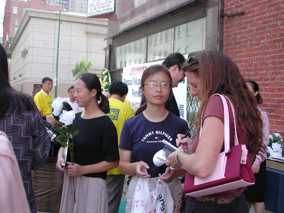 记者对弟子们进行采访参加绝食的弟子在发正念