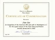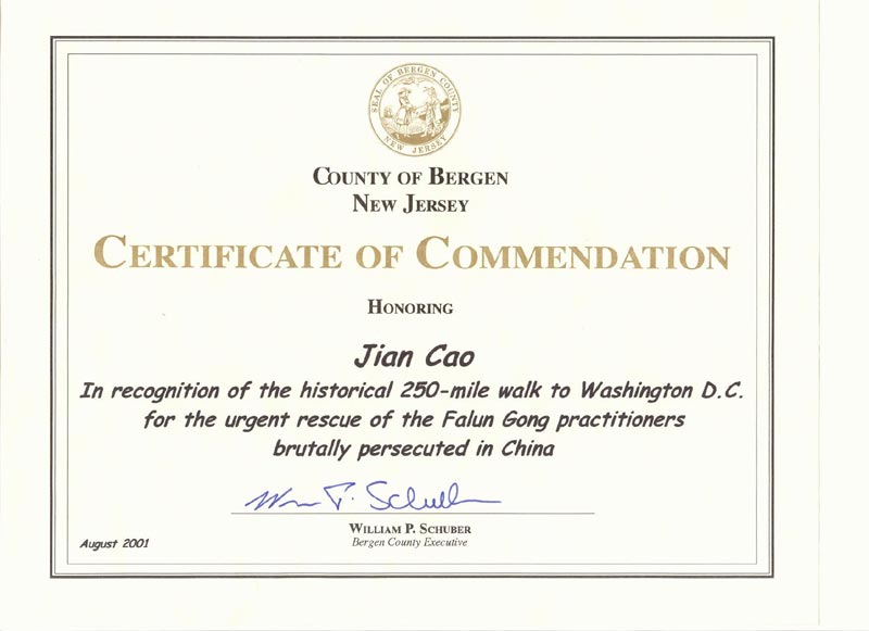 【明慧网2001年9月1日】新泽西州伯根郡郡长William P. Schuber2001年8月褒奖参加长途步行的法轮功学员曹建。