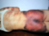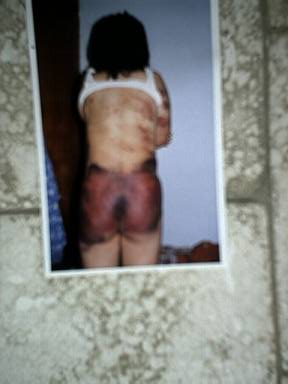 图片说明:邪恶之徒抓不到该大法弟子,竟把他不炼功的妻子抓走非法毒打的惨状。