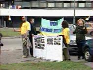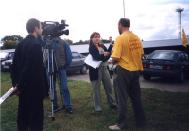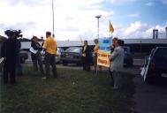 我们站在机场外交通道的出口,向前来采访访问活动的媒体记者们发放了“SOS,法轮功”的报章。有三家大型电视台立即现场采访了我们,给了我们向公众揭露中国当局非法镇压的机会。