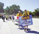 【明慧网2001年9月11日】世界日报九月十一日消息,继八月中的绝食请愿后,大华府及新泽西地区法轮功学员九月六日又发动一项横跨北美徒步请愿行动,属于法轮功「SOS--向全球呼救中国法轮功学员行动」的一支,加入北美长征的十四名法轮功学员六日上午在国会山庄前出发,他们计画以三个月的时间徒步抵达终点加州洛杉矶。(图与文:许惠敏)