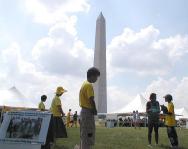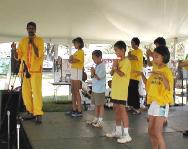 一对黑人弟子夫妇为了这次洪法活动做了许多工作。两天内,许许多多的黑人与大法结缘。他们不但欣然接下传单,还积极地学炼功法。有时,炼完一套静功,周围便坐着一圈小孩儿,认真地闭着眼睛模仿着做着不标准的动作。家长们则在一旁笑呵呵地静静地看着;有的家长鼓励着害羞的孩子们也加入进来。其中一个小孩儿学完后跑到母亲面前席地而坐,给母亲表演了起来。有个黑人老奶奶,看到黄T恤便主动走过来要求坐下,紧接着便问是否可以随着一起炼功,还问在什么地点炼功更合适,她告诉我们她的一个朋友是纽约的法轮大法弟子。今天,她欣喜地一眼见到我们,就迫不及待地请求学习功法。有的是夫妻一起学炼法轮功的,有的是一家老老少少学炼的。大部份学的人都是一学就是很长时间,很认真,久久不愿离去。傍晚,发完正念,回头发现一个母亲带着两、三岁的小女孩儿坐在我们的背后,两个小女孩儿结着印坐着。其中大一点的女孩儿还双盘着。