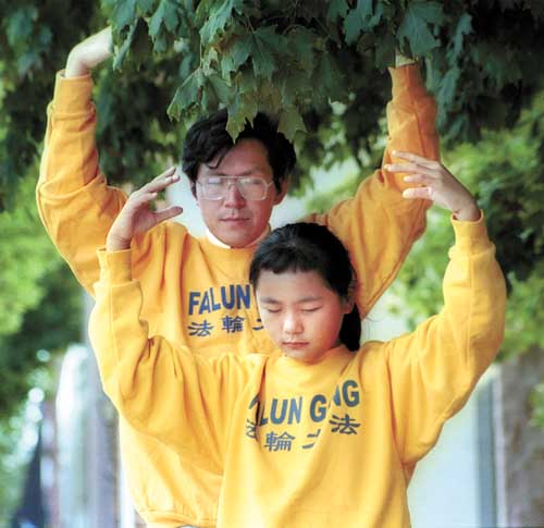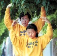 【明慧网2001年9月12日】[图]任崔农(音译)和他的女儿丝琳娜(Selena)星期六在扬克顿(Yankton )郡法院外展示了法轮功的功法。任和他的妻子江素在南达科他州(Dakota)东部各地介绍这个可以令人松弛的功法,而该功法已被中国(江泽民)政府禁止。任是南达科他州立大学植物科学的副教授。他全家居住在布鲁金斯(Brookings)。(丹·斯普林格摄)
