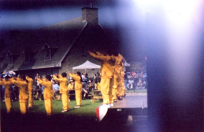 这一天,天空清澈,阳光明媚,很多人都来过节了。下午1点30分,我们在节日临时搭建的舞台上做了5套功法的演示。当我们走上舞台时,人群中响起了掌声;回头看去,人们齐刷刷的目光投向了我们。炼功音乐一起,人们立即安静下来了。在功法演示过程中,有人在台下跟着学,节日的吉祥物在催促孩子们跟我们一起做。一位弟子随着炼功音乐讲解着五套功法的动作,并在恰当的时机告诉了人们中国大陆大法修炼者遭受的残酷迫害,使其与现实中祥和、宁静的炼功场面形成了鲜明的对比。