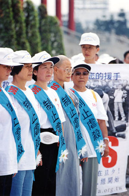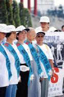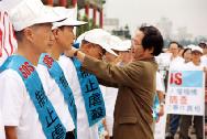 | 立法委员简锡皆亲自为学员戴上“制止虐杀”的佩带 | 参加环岛步行的学员 |