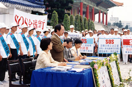 临行前,在台北中正纪念堂举办了一场记者说明会,尽管中共以拒发赴大陆采访证为要胁,阻挠台湾媒体报导任何有关法轮功的活动,但是仍有十数位中外媒体记者到场参加,场边另有约500位台北地区的学员,将于会后一起加入台北市的陪走行程。此时笼罩上空的乌云在残喘地挤下几滴雨之后散去,阳光露了脸,前来参加记者会的贵宾及记者先生小姐们,会后纷纷在我们的征签看板上签名声援;同时,参与步行的学员也开始踏上正法之路。