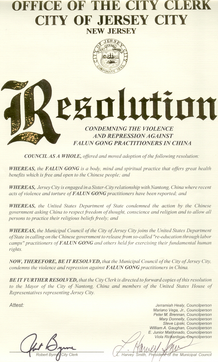 为此,泽西市市议会决定:谴责对中国法轮功学员的迫害和镇压,