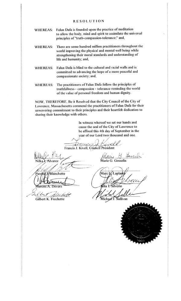 马萨诸塞州劳伦斯市通过决议褒奖法轮功学员