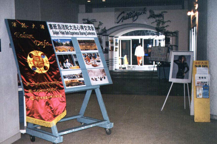 9月9日法会正式举行。上午台湾弟子和塞班岛弟子一齐集体炼功发正念,下午共20多人发言谈心得体会。同时在会场内举办“正法之路”图片展,以及放映放光明电视组制作的《钢琴独奏》和《生命的歌》。感谢台湾弟子带来很多彩旗,把会场布置的庄严肃穆。