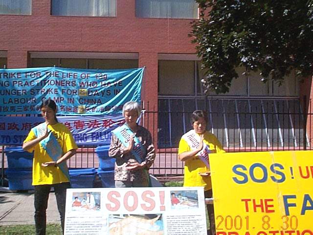 多伦多大法弟子自8月20日上午九点开始的绝食声援行动,至今已10天了。在这不同寻常的日日夜夜里,先后有五批多伦多大法弟子参加了绝食行动,他们中有60多岁的老人,有年轻的母亲,有博士和公司的职员。一名西人学员白天不能来,夜晚来到了这里,当晚天气很冷而他只穿了一件短袖衫,同修们递上一件衣服,他穿上后执意要敞开胸,因为系上扣子就会将短袖衫上的大法字样挡住,他说我要让过往的人们都看到。一些同修身在中领馆,心中时时关注着中国大陆同修和世界各国大法弟子的情况,有弟子将明慧的文章下载,给同修们传看。