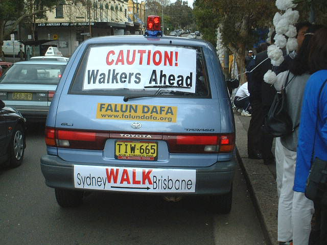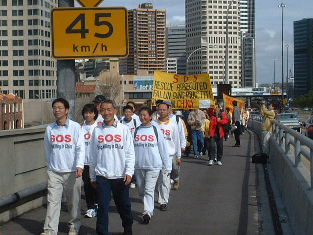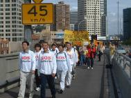 11点45分,举行了“走到布里斯本去!SOS游行”。百余名大法弟子举着醒目大横幅“停止在中国的虐杀”、“SOS!紧急救援在中国受迫害的法轮功学员”、“法轮大法”、“真、善、忍”……,身穿“SOS”(“紧急救援”)白色上衣的学员,在悲壮的《普度》、《济世》音乐声中,缓缓前行,场面肃穆,吸引着不少市民驻足观看,再次被法轮功学员在中国遭受残酷迫害的血淋淋的事实真相所震撼,也为法轮功学员“走到布里斯本去!SOS紧急救援中国受迫害法轮功学员”的和平抗争精神而强烈震惊。一位西人青年戴维连问数遍:“你们走到布里斯本去?”当他证实自己没有听错时,马上加入到游行的行列,并走到最前面,双手将横幅高高撑起,同时表示:每个人都应有信仰的自由。