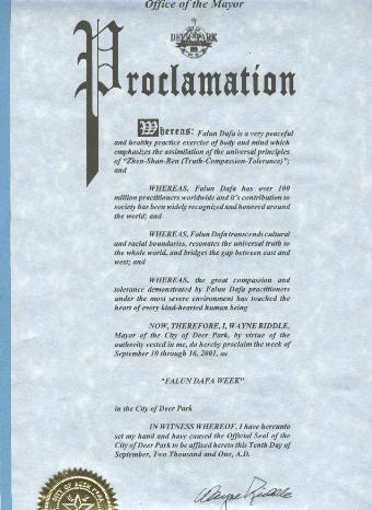 因此,我,维尼·里得尔,德尔比克市市长宣布2001年9月10日到16为本市“法轮大法周”