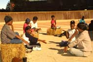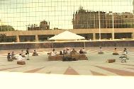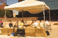 在九月十五日这天,法轮大法学员同时参加了三项活动:健康节,体育活动节和艺术节。由艺术家法轮大法学员设计制作的休息亭摆放在市中心圆形广场的最中央,亭子里铺着手工编制的草垫,亭子四周环绕摆放着供打坐用的草垛。在大法音乐的伴奏下,近二十名学员同时演炼法轮大法的第五套功法,整个场面既祥和又壮观。习惯了都市生活的人们,当意外地看到这片宁静和祥和后,纷纷加入其中……
