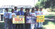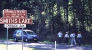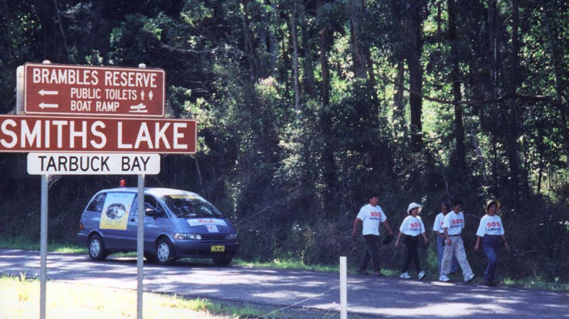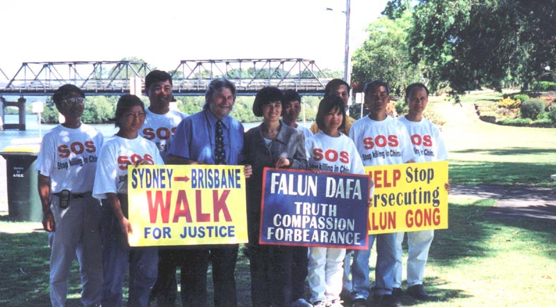 较窄的公路两旁已没有路可行了,步行弟子只得下到干枯的水沟里走,有的倾斜着身子走到陡峭的沟坡上。这时,从后面追上来一辆小汽车,一位西人女士从汽车里探出身子向我们招手示意,我们返身朝她的汽车方向走去。原来,她是地方报《Camden Haven Covier》记者Ms. Carol,她已看过SOS紧急救援呼吁的资料,并非常感兴趣,赶来想给我们拍照。我们和她在一起合影留念。她和我们一一握手,祝我们好运。她说,她会将相片刊登在法轮大法消息的下一期报纸上,按征集签名表上的邮政地址寄给我们。