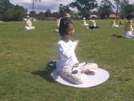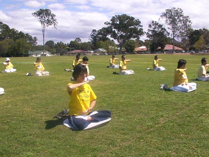 学员们利用此次机会向海外华人深入讲清真相。运动场的栏杆上悬挂着“法轮大法免费教功”的横幅,在大法摊位两边挂着“功修有路心为径 大法无边苦作舟”的竖幅,树上还挂有“真善忍”的气球。摊位上摆放着不同文种的大法书籍,和各种大法资料,报章,简介和讲真相材料。会场的走廊办成了大法图片展,部分“正法之路”图片深深的吸引着与会者的关注。大法镇压前在中国北京,长春,沈阳,济南等地集体大炼功的壮观场景,和在世界各地包括日本,美国,印度,香港等地的洪传盛况,及海内外众多的政府褒奖,引起驻足观看的人们的深深思考。两天内,学员们被邀请三次在运动场中央的大草坪上集体大炼功,展示功法,每次为时半小时。整齐的黄衣白裤映衬在蓝天白云下,突现大法弟子的宁静与祥和,向世人展现出大法的风貌。过程中炼功音乐,和介绍功法,讲清真相的旁白在会场内外回响,大法的宏伟之声响彻天宇。
