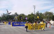 在游行开始前,学员们集体发正念,铲除干扰众生得法的邪恶因素,让更多有缘的人了解大法,了解真相。上午9点45分,游行开始了。当市民们看到了真、善、忍几个大字时,禁不住读了起来,并竖起大拇指。他们说现在这个时候更需要宁静祥和的法轮大法。我们的游行队伍所到之处,不时受到市民们的叫好和欢迎。学员们更是不时地利用机会向市民们展示着功法,每次都赢得了市民们的热烈掌声。很多市民都接过我们学员手中的大法资料。