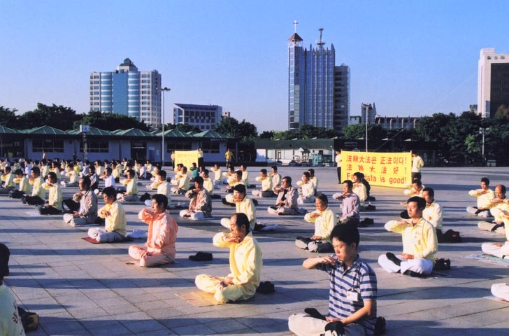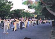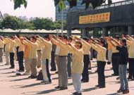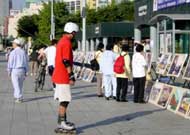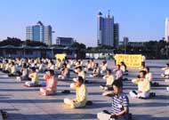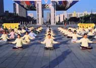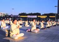9月16日下午1时,100多幅大法图片与330余名学员的集体炼功,给慕名而来得法的近100名有缘之士留下了深刻的印象,吸引了众多来这里休闲的游客。