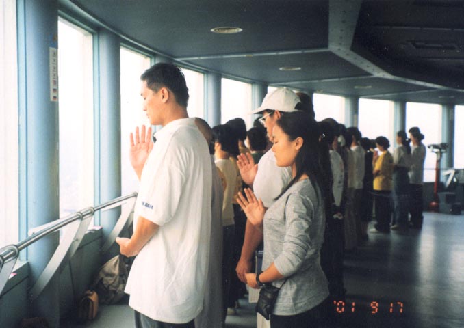 然而,句号并不意味着交流的终结。为了加深与韩国学员的交流,台湾同修在汉城多住了一天,即使在交流会结束的16日晚上,也与汉城地区一部分学员们继续交流,并向佛学会提议17日晚再与汉城辅导员们交流。白天他们陪同前来韩国拍摄专题片的摄影组走几个地方,每一个地方都成了他们向世人讲清真相与洪法的地方,这些台湾同修为了洪法,每个人都特意学了用韩国语说"法轮大法好!",所到之处都献上了他们"助师世间行"的颗颗纯正之心。