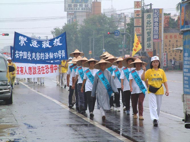 前方有徐徐为我们开路的警车,后面是大法弟子整齐的步行队伍,分别从台北和宜兰两条路线沿途步行下来的同修,他们坚毅的脸庞在竹笠帽的衬托下尤显道骨仙风,那缓缓移动的黄色T恤辉映得整条马路金光灿烂,正法之路何浩荡!