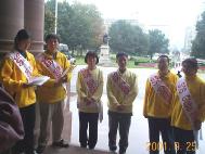 在细雨中,大法弟子在省议会前举行了简短的出发仪式。步行者代表发言,省政府代表和政党代表接受了学员们递交的信件。四名记者在细雨中拍照、采访。