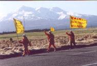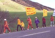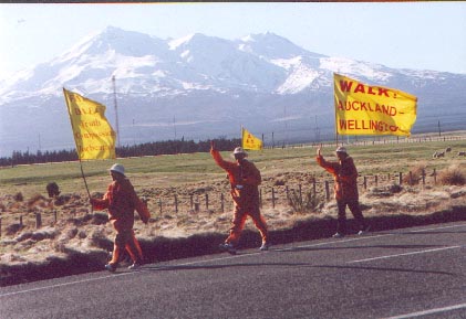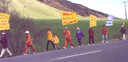 六点整,集体炼动功,然后吃早饭。步行小组的功友们把一切都安排得有条不紊。接下来开车送我们来的功友把步行小组送到了出发地。就这样,步行小组开始了第13天的行程,而我,开始了第一天的步行。天气真好,蓝天上的白云朵朵,不远处的雪山,风景如画,阳光照射在我的左脸上暖洋洋的,而右脸被从雪山刮过来的风吹得冰冷。我们的横幅也被雪山风吹得“哗啦”做响,中英文的“法轮大法真善忍”,以及英文的“步行:从奥克兰至惠灵顿”;“中国停止虐杀”却显得格外清楚,一目了然。从边上驶过的汽车都放慢速度,看清横幅后,不断地鸣笛致意,善良的新西兰人从车窗伸出大拇指。
