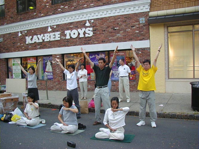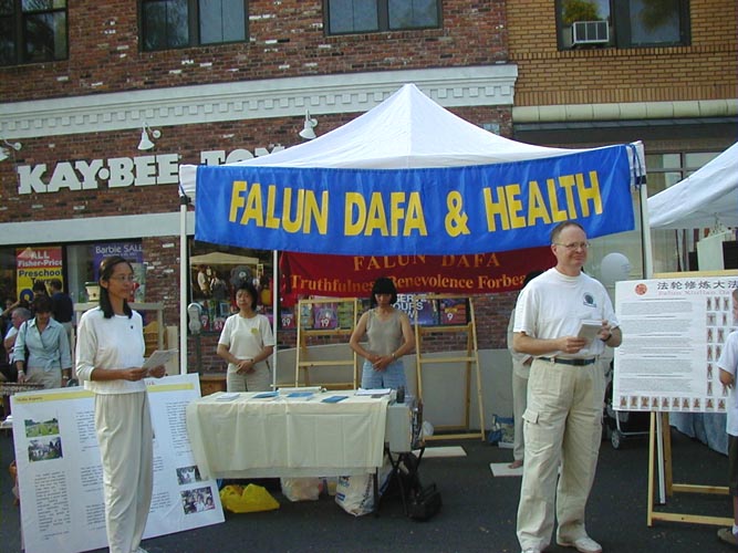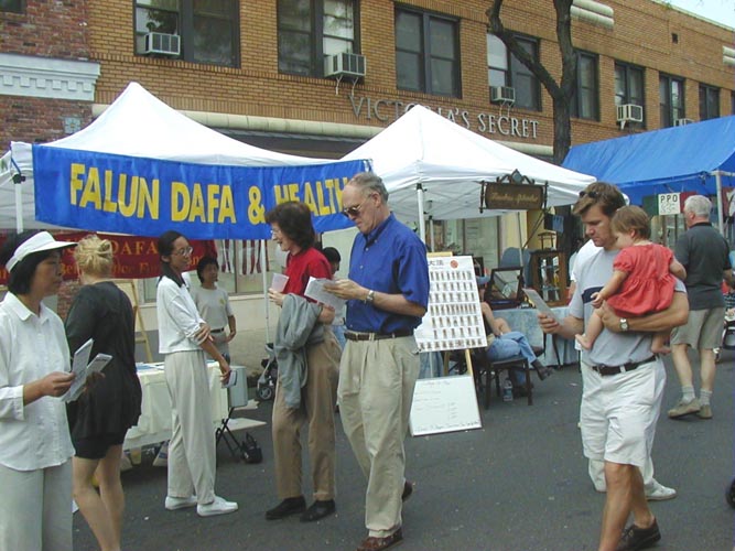 当学员们展示功法时,一个淘气的小男孩问父亲这是什么运动?父亲不加思索地说,这是一种对身心都有益的运动,然后对着活泼的儿子说:“我想你很需要去学。”学员连忙递上一份简介,并告诉父子这是法轮功。