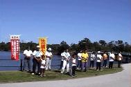 在小分队中有一对姐妹,她们每天一边走一边发资料,凡是从她们身边经过的人,她们都送上一份大法资料。当中途休息时,大家都坐下来休息,姐妹俩默默地向周围的行人发大法资料和报纸。即使去买东西,她们也带上资料和签名册,向店员洪法和征求签名,有不少年轻的店员在了解法轮功学员在中国被酷刑迫害的事实和我们这次长途步行的目的后,都在签名册上签了名。