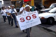 一路上,大家一边向路人发大法资料,一边紧跟队伍,有时遇到离道路较远的高层住宅,老年学员们都争着跑去送资料。一位约六十多岁的大妈拿着“SOS世界长途步行紧急救援活动从福冈到东京”的牌子,快步走在队伍的最前面,路上过往的车辆和行人都放慢速度仔细的观看大妈拿着的牌子上的字,很多人接过学员递上的SOS紧急救援活动的传单及大法报纸。