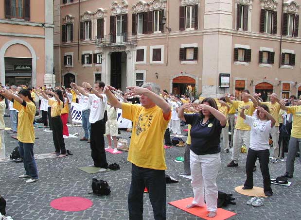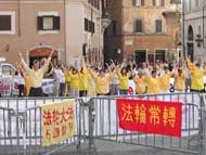 早上9:00,下过一夜暴雨的罗马,天空非常晴朗,气温温和。200多名大法弟子来到议会广场,随着炼功音乐连续演示5套功法,并多次齐发正念,祥和的气氛和优美的动作,引起了在议会门前执勤的警察,和过路的行人和来上班的议员们的好奇和关注。由于在纽约发生的恐怖主义事件,许多媒体都曾表示对我们的活动没有兴趣,不准备来采访。大约十点钟左右,我们却看到各主要电视台,新闻社和报纸记者都纷纷到场,对学员的炼功场面进行长时间拍摄,并对在场学员进行采访。