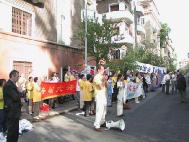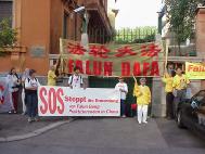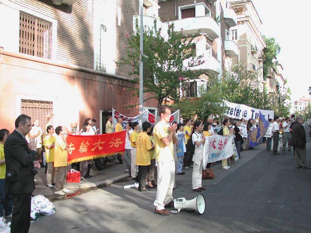 下午3点,游行队伍从著名的西班牙广场出发。走在队伍最前面的是欧盟议员帕内拉,还有许多NTC成员和激进党成员和其它协会的成员参加了游行。大法弟子抬着花圈,举着横幅,在“普度”“济世”的音乐下,穿过市区向中国大使馆进发。整个队伍庄严肃穆,行人和居民纷纷驻足观看,许多弟子在队伍两边散发真相资料。在警察的保护下,长长的队伍来到中国大使馆门前。大家首先齐发正念,意大利大法弟子代表念了致中国大使的请愿信,随后由帕内拉议员递交请愿信并要求会见中国官员。可惜大门始终紧闭,里面只有一个意大利女士,回答说她接到命令,不可以接信和开门。甚至当议员先生说:“我只是罗马的一个邮差,是否可以接我的信”时,收到的还是否定的答复。最后,在记者,警察和众人面前,议员将信放进了大使馆的信箱里。
