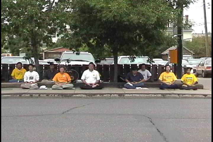 开车期间,我们仍然和当地一家广播电台进行了电话采访。到达城市后,我们在预先安排好的地点支起了横幅,并集体炼功。那是在公开场合演示功法的难得机会,因为城市里交通繁忙。我们组的一名成员后来说,这个城市或许从未有过如此繁忙的交通。