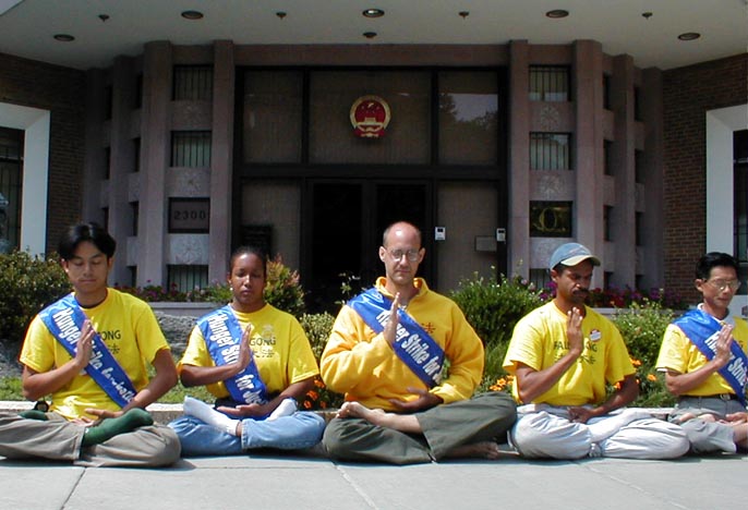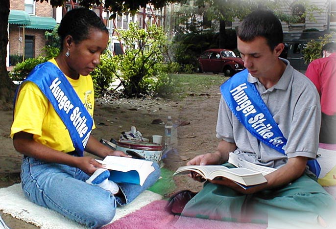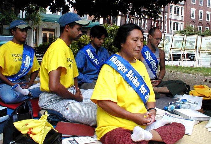 继6名法轮功弟子于8月28日向联合国秘书长安南先生递交了被他们称为“心声信”后,美国首府华盛顿的中国大使馆外,法轮功弟子还在进行接力昼夜大绝食。许多西人法轮功弟子也在进行绝食请愿。Steven,一位23岁的西人小伙子,在接受记者采访时说,他将进行持续3天的绝食请愿,他表示,在法轮功中,不存在国家的界限,中国迫害的是一个在向着“真、善、忍”升华的整体。一位西人女士,Donna,表示她来参加绝食,是因为她想提高美国民众对中国正在迫害法轮功之事的注意力,因为这是迫害人类的行为。她的丈夫也来到大使馆前支持。六名向联合国秘书长安南先生递交“心声信”中的一位西人法轮功弟子,一来(音译),称迫害法轮功不只是中国的内政,它是对全人类的人权的侵犯。他特别希望布什总统10月份去中国时,能为美国永久居民滕春燕女士带回自由。除了首府华盛顿,在加拿大,德国,澳大利亚,纽约等世界各地,东西方人士正在为正义共同展开全球接力大绝食。