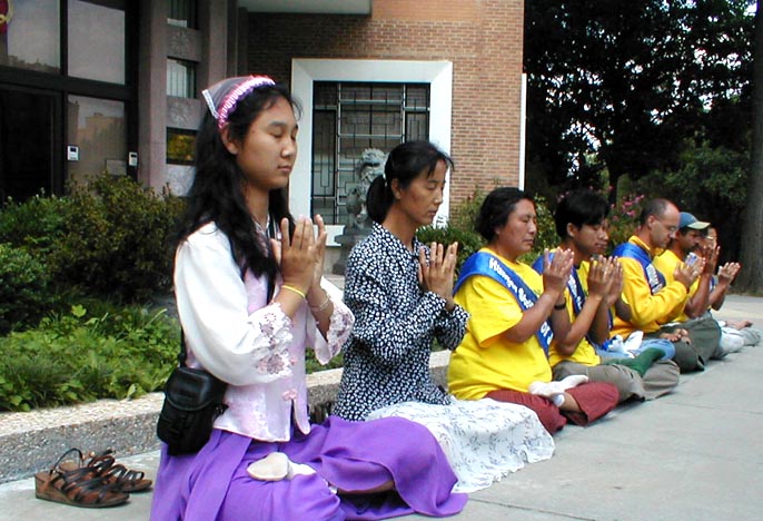 中国领事馆位于一个居民区内,9月2日是个星期天,这天领事馆前的马路上显得格外忙碌,汽车来往不断,也许许多人是专门到这来看看的。这儿的居民太熟悉法轮功了,安静的环境中,总能见到这些平静、和善的学员的身影,他们也同样在时刻关注着这些为真理而如此付出的人们。人们的车驶到此处,总象被什么所吸引而慢下来,有些人在此鸣笛以示支持。一大早,一个警察赶来,对我们笑了笑,点点头,就放心地走了。绝食的弟子们每一个整点发一次正念,其余时间炼功、学法。