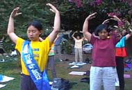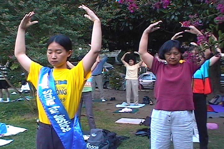 | 绝食弟子在“天安门花园”炼功 | 绝食弟子Danna和Steve静静地学法 | 大法弟子在“天安门花园”炼功 |