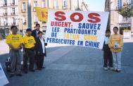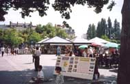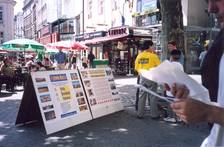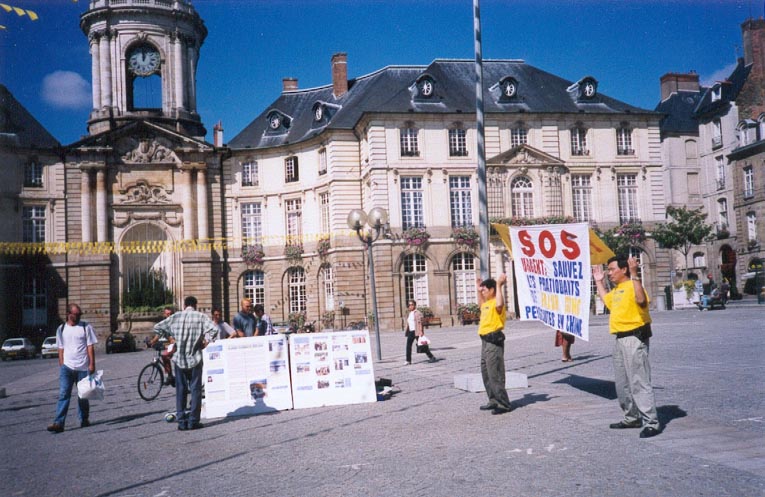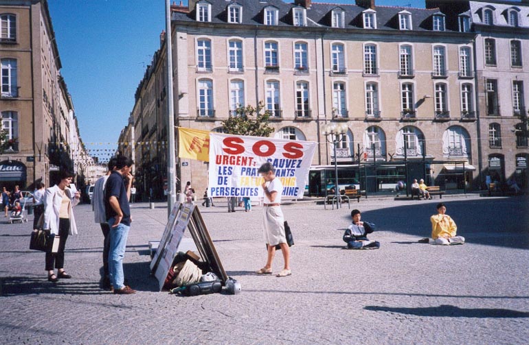 第四天在布列塔尼的首府Rennes(雷恩),我们被允许在市政府广场洪法、炼功。我们一早来到广场,不失时机地向市政府前站岗的警察洪法。警察建议我们地点选在广场中心,因为会有更多的人看到。写着“SOS!紧急救援在中国受迫害的法轮功学员”的白底大字横幅、功法介绍和法轮功真相的看板及优美的炼功动作和音乐吸引着过往的人们驻足观看、询问。