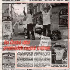 乘公车来到捷克共和国莫拉瓦的首都布鲁。同在布拉提斯拉瓦一样,我们得到了善良人及地方官员的帮助,取得了‘难以取得的’且是城中最繁忙地段的许可。这一次我们没有去网络咖啡屋发电子邮件,而是直接到各媒体办公地告诉他们我们的事情。他们派来了记者、照相师和电台采访。第二天,我们就在报纸上看到我们的功法演示。