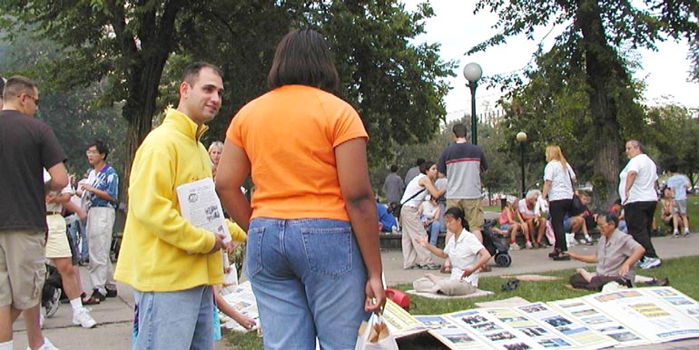 星期五,一位学员刚开始向人们发传单,发到一个摊位时,摊位里的一个人就冲她吼道:“你不能在这发传单。”当时这位学员很平静,她一边发正念,一边把传单递给那人身旁的一个人,这个人接过传单后,这位学员就讲中国法轮功学员所遭受的迫害。当她离开时,她对那个吼叫的人说:每个人都应该帮助制止这残酷的虐杀。他还向这位学员点点头。