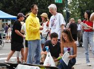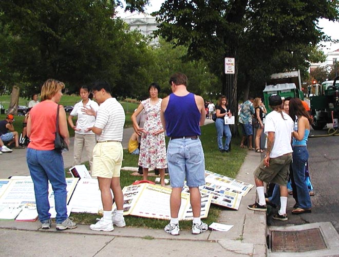 这几天,丹佛市的天气是九月初少见的热,学员们顶着烈日,向人们演示功法,介绍法轮功和迫害真相,向过往的人们发传单。四天的洪法活动,剩下的传单寥寥无几。