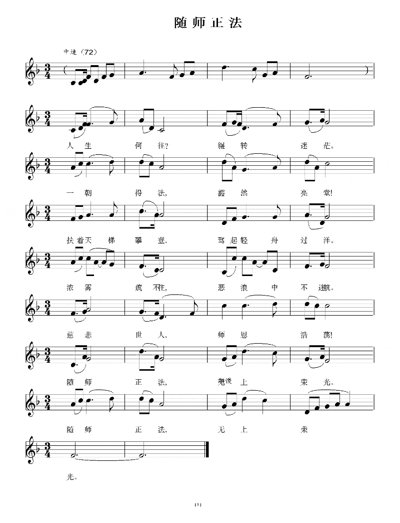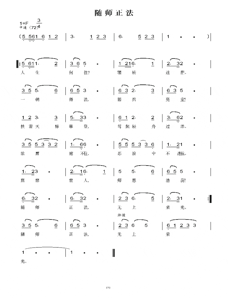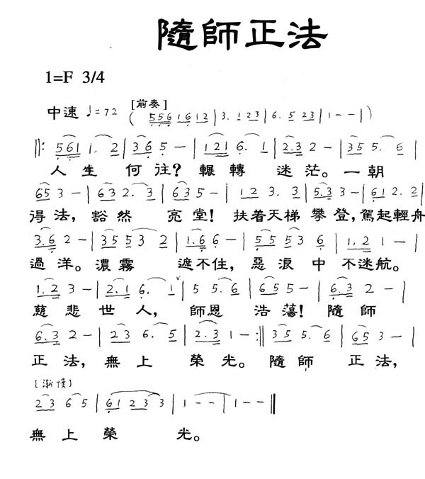 歌词:人生何往?辗转迷茫。一朝得法,豁然亮堂!扶着天梯攀登,驾起轻舟过洋。浓雾遮不住,恶浪中不迷航。慈悲世人,师恩浩荡!随师正法,无上荣光。随师正法,无上荣光。