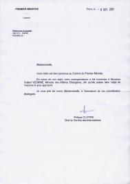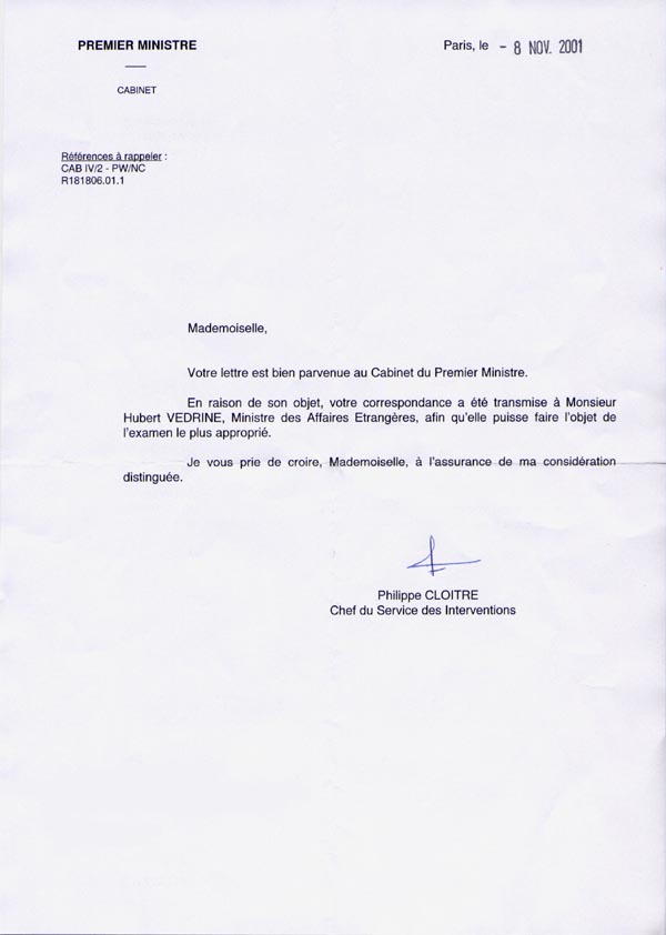 小姐, 总理办公室已收到您的信件。 我已将您的来信转给了外交部长于贝尔- 魏德林(Hubert VEDRINE) 先生, 以便对此事能够做出最适当的调查。 小姐,请您接受我的崇高敬意。