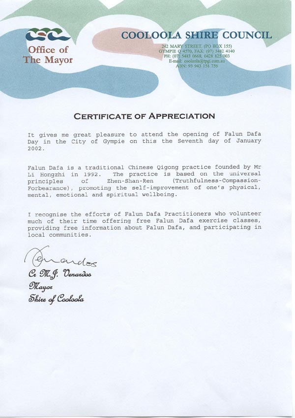 (签名)麦可.威纳多斯(Mick Venardos) 市长库鲁拉郡(Cooloola Shire)