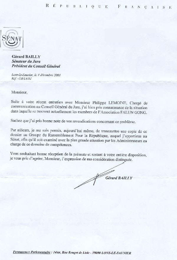 您最近与汝拉省议会负责外界联络的菲利普-勒穆瓦纳(Philippe LEMOINE)先生会晤后,我充分了解到法轮功协会成员目前的处境。